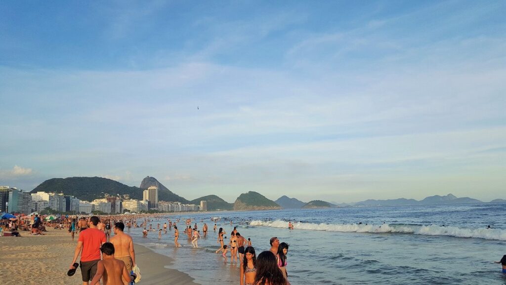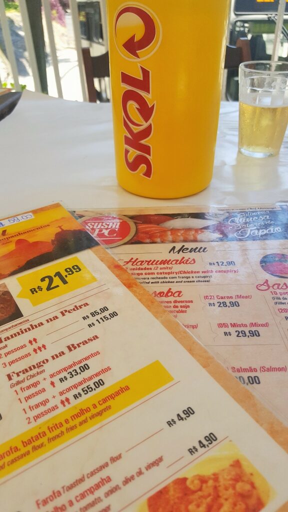 Pierwszy dzień okazał się dla moich nóg tak męczący, że wyprawę skończyliśmy na plaży Copacabana, totalnie przereklamowanej dla dziewczyny z Mazur, która plaże ma co krok. Jednakże woda, słońce, widoki na góry i fawele… to może zaserwować jedynie Rio de Janeiro. Po nabraniu słoneczka nic tak nie zrelaksowało, jak piwko w barze z muzyczką egzotyczną na plaży… Żyć nie umierać… (powiedziałam, nie myśląc, że kolejny dzień będzie traumą dla moich stóp 😀 )