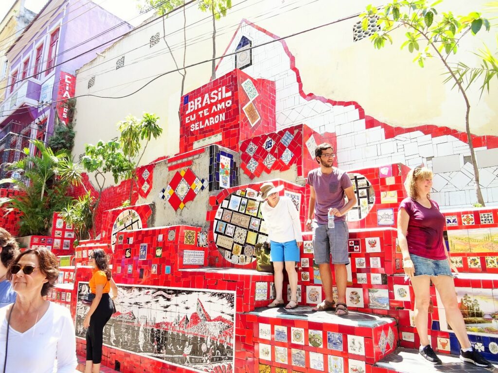 Zwiedzanie rozpoczęłam od najsłynniejszych schodów w Brazylii, czyli Escadaria Selarón. Upał dawał do zrozumienia, że kokosowa woda jest niezbędna, a dziewczyny z super ułożonymi włosami i pełnym makijażem wkurzały brakiem wyrazu zmęczenia, czy też upału… Schody: no WOW! Ktoś się namęczył, żeby tak dopracować detale, także chyba na każdym zrobiłyby duże wrażenie. Budowane przez Jorge Selarón od 1990 roku, który w ten sposób chciał naprawić i upiększyć schody do własnego domu, kolorami flagi Brazylii, przykuwają wzrok.
