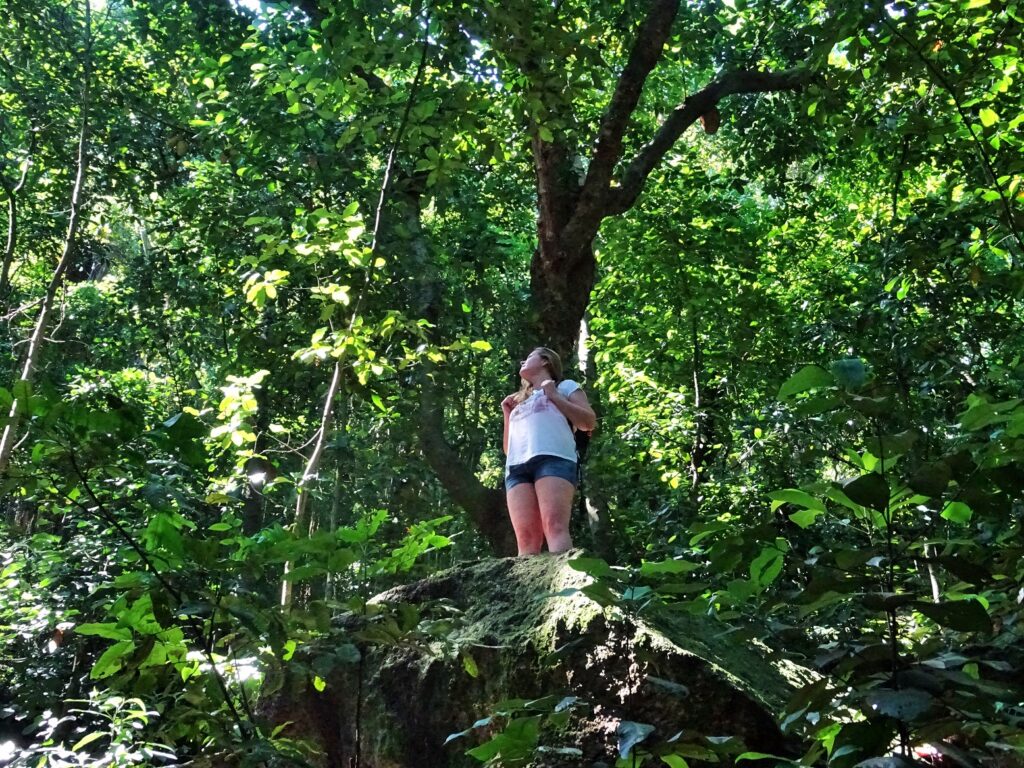 Po zejściu ze schodów o niczym innym nie marzyłam, jak o cieniu. Także wskoczyliśmy do Ubera i w ciągu 20 minut byliśmy już w innej części Rio, by w klimatach tropikalnych odpocząć choć przez chwilę. W ten sposób wylądowaliśmy w Área de Proteção Ambiental de Santa Teresa i pomyślałam: kto wchodzi do tropikalnego lasu w … klapkach? Chyba tylko wariaci… 😛 Miejsce faktycznie przypomina Amazonię, piękne, ogromne drzewa, zapach… do dziś czuję. Szczerze… to poszliśmy tam, żeby zaprzyjaźnić się z małpkami, jednak zostaliśmy kompletnie olani. Wolały bawić się z małą dziewczynkę, która opowiadała nam o całej rodzinie małpek, które dopiero co uciekły.